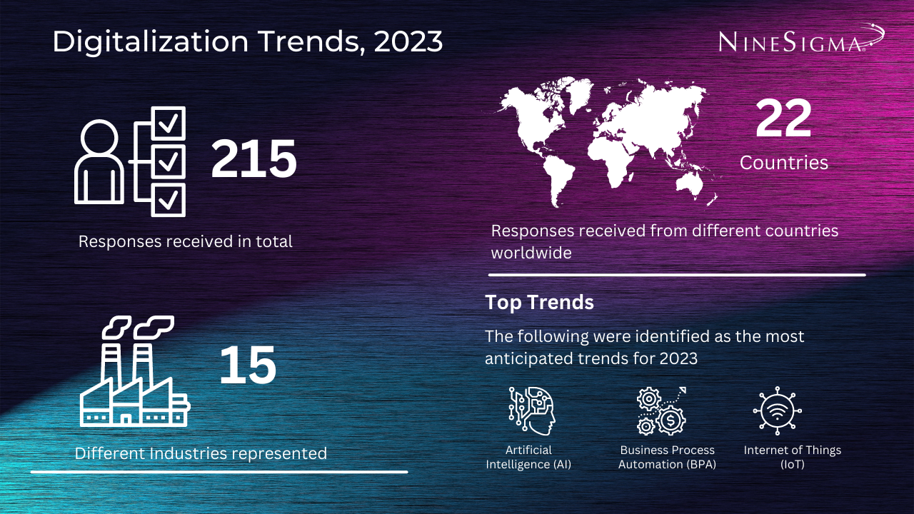 Our recent survey received 215 responses from experts across 22 countries and 15 different industries, showcasing the global reach of digitalization and its impact on various business functions. In 2022, the most significant impacts of digitalization were in the areas of smart factories, AI in healthcare, digital management technologies, AR/VR/Metaverse, and AI-driven customer service. The results of the survey indicate that the digital advancements most eagerly awaited in 2023 are in the areas of AI, Business Process Automation and Internet of Things. NineSigma helps companies tackle their most pressing innovation challenges with reduced risk and increased confidence. By leveraging the power of our networks and expertise, businesses can remain competitive and drive digital transformation.
