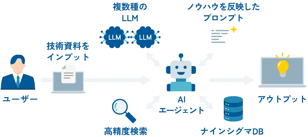 複数種類のAIを内蔵しているため分野ごとに得意なAIが対応。用途探索はナインシグマ独自のデータベースを学習するため、短時間で質の高いアウトプットを得ることができる。